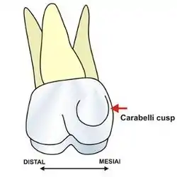 The cusp of Carabelli, or Carabelli's tubercle, or tuberculum anomale of Georg Carabelli is a small additional cusp at the mesiopalatal line angle of maxillary first molars. This extra cusp is usually found on the first molar, and becomes progressively less likely in the second, third molars. This cusp is entirely absent in some individuals and present in others in a variety of forms. In some cases, the cusp of Carabelli may rival the main cusps in size. Other related forms include ridges, pits, or furrows. This additional cusp was first described in 1842 by the Hungarian Georg Carabelli (Carabelli György), the court dentist of the Austrian Emperor Franz.