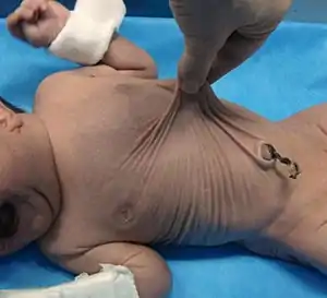 It is characterised by skin that is loose, hanging, wrinkled, and lacking in elasticity. The loose skin can be either generalised or localised.[4] Biopsies have shown reduction and degeneration of dermal elastic fibres in the affected areas of skin.[5] The loose skin is often most noticeable on the face, resulting in a prematurely aged appearance. The affected areas of skin may be thickened and dark. In addition, the joints may be loose (hypermobile) because of lax ligaments and tendons. When cutis laxa is severe, it can also affect the internal organs. The lungs, heart (supravalvular pulmonary stenosis), intestines, or arteries may be affected with a variety of severe impairments. In some cases, hernias and outpouching of the bladder can be observed. Patients can also present with whites of the eyes that are blue.