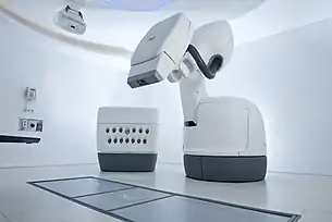 The device combines a compact linear accelerator mounted on a robotic manipulator, and an integrated image guidance system. The image guidance system acquires stereoscopic kV images during treatment, tracks tumor motion, and guide the robotic manipulator to precisely and accurately align the treatment beam to the moving tumor.[2] The system is designed for stereotactic radiosurgery (SRS) and stereotactic body radiation therapy (SBRT). The system is also used for select 3D conformal radiotherapy (3D-CRT) and intensity modulated radiation therapy (IMRT).