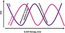 It is considered that the mutation causes a decrease in the "neutrophil production or excessive apoptosis (shorter half-life)" which results in a deficiency of mature neutrophils in the blood.[13] The exact pathological mechanism is still researched, with the main hypotheses being mislocalization of ELANE or unfolded protein response (UPR) induced by mutant ELANE,[14] however according to Mehta et al. (2016), the "UPR induction by mutant ELANE is not strong enough to promote cell death and that mutant ELANE causes SCN through an alternative mechanism".[15] According to Garg et al. (2020), new "findings challenge the currently prevailing model that SCN results from mutant ELANE, which triggers endoplasmic reticulum stress, UPR, and apoptosis".[16] The expression of the ELANE gene has been linked to GFI1 gene,[8][17] and some considered that interaction with other genes causes the emergence and severity of one or the other phenotypic disorder.[9] It is unclear what causes the cyclic aspect in CyN.[17] According to Donadieu et al. (2011), the "cyclic aspect ... suggests the existence of a cryptic biological clock that regulates granulopoiesis. This putative clock might be revealed by particular mutations".[13] Michael Mackey "postulates that the production of neutrophils is governed by long‐range stimulatory factors in a long feedback loop that has a built‐in time delay in the maturation of promyelocytes to fully differentiated neutrophils".[18] It is also not clear what causes that the levels of secretory leucocyte protease inhibitor (SLPI), which influences the induction of the unfolded protein response (UPR), are not diminished and as such activation of UPR is absent in CyN compared to SCN, in other words, different ELANE mutations "have different effects on UPR activation, and SLPI regulates the extent of ELANE‐triggered UPR".[19]