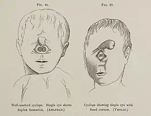 - In 2006, a baby girl in India with cyclopia was born. Her only eye was in the center of her forehead. She did not have a nose and her brain did not separate into two separate hemispheres (holoprosencephaly).[14] The child died one day after her birth.[15]