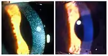 Slit-lamp photographs of three-year-old patient with nephropathic cystinosis before (left) and after (right) cysteamine eyedrop therapy. The drops dissolve the crystals in the cornea.