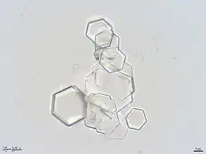 | These cystine crystals were found in the urine sediment of a male dog who presented to the veterinary hospital with a history of chronic stranguria (straining to urinate) and pollakiuria (abnormally increased frequency of urination). A cystotomy was performed and numerous cystoliths (bladder stones) were removed. 5μm scale bar; 1,000x magnification; focus-stacked image consisting of 12 exposures; courtesy of Lance Wheeler. | |