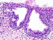 Cystitis glandularis is the transformation of mucosal cells lining the urinary bladder. They undergo glandular metaplasia, a process in which irritated tissues take on a different form, in this case that of a gland.[1] The main importance is in the findings of test results, in this case histopathology. They must distinguish a benign metaplastic change from the cancerous condition urothelial cell carcinoma.[2] It is a very common finding in bladder biopsies and cystectomies, and most often found in the trigone area. Cystitis glandularis lesions are usually present as small microscopic foci; however, occasionally it can form raised intramucosal or polypoid lesions. The cystitis glandularis lesions are within the submucosa.