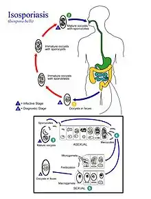 Cystoisospora belli, previously known as Isospora belli, is a parasite that causes an intestinal disease known as cystoisosporiasis.[1] This protozoan parasite is opportunistic in immune suppressed human hosts.[2] It primarily exists in the epithelial cells of the small intestine, and develops in the cell cytoplasm.[2] The distribution of this coccidian parasite is cosmopolitan, but is mainly found in tropical and subtropical areas of the world such as the Caribbean, Central and S. America, India, Africa, and S.E. Asia. In the U.S., it is usually associated with HIV infection and institutional living.[3]
