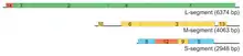 Cystoviruses have a tripartite double-stranded RNA genome which is approximately 14 kbp in total length. The genome is linear and segmented, and labeled as large (L) 6.4 kbp, medium (M) 4 kbp, and small (S) 2.9 kb in length. The genome codes for twelve proteins.[1][2]