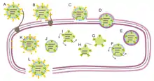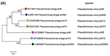 Most identified cystoviruses infect Pseudomonas species, but this is likely biased due to the method of screening and enrichment.[6] The type species is Pseudomonas virus phi6, but there are many other proposed members of this family. Pseudomonas viruses φ7, φ8, φ9, φ10, φ11, φ12, and φ13 have been identified and named,[5] but other cystovirus-like viruses have also been isolated.[6] These seven putative relatives are classified as either close (φ7, φ9, φ10, φ11) or distant (φ8, φ12, φ13) relatives to φ6,[5] with the distant relatives thought to infect via the LPS rather than the pili.[7]