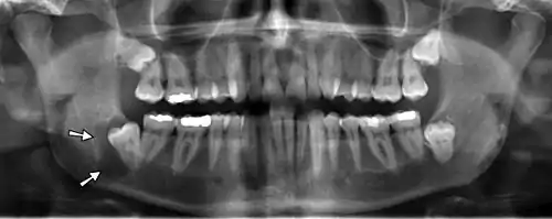 A cyst is a pathological epithelial lined cavity that fills with fluid or soft material and usually grows from internal pressure generated by fluid being drawn into the cavity from osmosis (hydrostatic pressure). The bones of the jaws, the mandible and maxilla, are the bones with the highest prevalence of cysts in the human body. This is due to the abundant amount of epithelial remnants that can be left in the bones of the jaws. The enamel of teeth is formed from ectoderm (the precursor germ layer to skin and mucosa), and so remnants of epithelium can be left in the bone during odontogenesis (tooth development). The bones of the jaws develop from embryologic processes which fuse together, and ectodermal tissue may be trapped along the lines of this fusion.[1] This "resting" epithelium (also termed cell rests) is usually dormant or undergoes atrophy, but, when stimulated, may form a cyst. The reasons why resting epithelium may proliferate and undergo cystic transformation are generally unknown, but inflammation is thought to be a major factor.[1] The high prevalence of tooth impactions and dental infections that occur in the bones of the jaws is also significant to explain why cysts are more common at these sites.