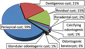 Periapical cysts (also called radicular cysts) are by far the most common cyst occurring in the jaws.[5]