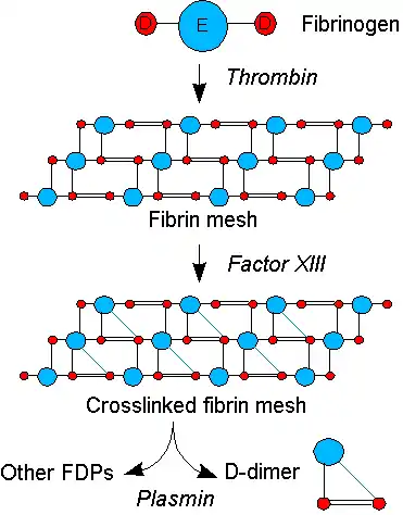 The circulating enzyme plasmin, the main enzyme of fibrinolysis, cleaves the fibrin gel in a number of places. The resultant fragments, "high molecular weight polymers", are digested several times more by plasmin to lead to intermediate and then to small polymers (fibrin degradation products or FDPs). The cross-link between two D fragments remains intact, however, and these are exposed on the surface when the fibrin fragments are sufficiently digested. The structure of D-dimer is either a 180 kDa[5] or 195 kDa[6] molecule of two D domains, or a 340 kDa[6] molecule of two D domains and one E domain of the original fibrinogen molecule.[1]