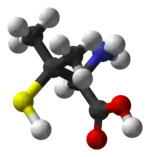 Penicillamine is a trifunctional organic compound, consisting of a thiol, an amine, and a carboxylic acid. It is structurally similar to the α-amino acid cysteine, but with geminal dimethyl substituents α to the thiol. Like most amino acids, it is a colorless solid that exists in the zwitterionic form at physiological pH. Of its two enantiomers, L-penicillamine (having R absolute configuration) is toxic because it inhibits the action of pyridoxine (also known as vitamin B6).[18] That enantiomer is a metabolite of penicillin but has no antibiotic properties itself.[19] A variety of penicillamine–copper complex structures are known.[20]