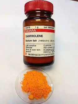 Dantrolene sodium, sold under the brand name Dantrium among others, is a postsynaptic muscle relaxant that lessens excitation-contraction coupling in muscle cells.[3][4][5] It achieves this by inhibiting Ca2+ ions release from sarcoplasmic reticulum stores by antagonizing ryanodine receptors.[6] It is the primary drug used for the treatment and prevention of malignant hyperthermia, a rare, life-threatening disorder triggered by general anesthesia. It is also used in the management of neuroleptic malignant syndrome, muscle spasticity (e.g. after strokes, in paraplegia, cerebral palsy, or patients with multiple sclerosis), and poisoning by 2,4-dinitrophenol[7][8] or by the related compounds dinoseb and dinoterb.[9]