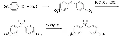 Synthesis of dapsone from 4-nitrochlorobenzene by E. Fromm and J. Wittmann, 1908[56]
