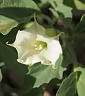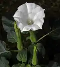 Datura is a genus of nine species of poisonous vespertine flowering plants belonging to the family Solanaceae.[1] They are commonly known as thornapples or jimsonweeds but are also known as devil's trumpets[2] (not to be confused with angel's trumpets, which are placed in the closely related genus Brugmansia). Other English common names include moonflower, devil's weed and hell's bells. All species of Datura are poisonous and potentially psychoactive, especially their seeds and flowers which can cause respiratory depression, arrhythmias, fever, delirium, hallucinations, psychosis, and even death if taken internally. Due to its effects and symptoms, it has occasionally been used not only as a poison, but also as a hallucinogen by various groups throughout history. Traditionally, psychoactive administration of daturas has often been associated with witchcraft and sorcery or similar practices in many cultures, including the Western world.[3][4] Certain common datura species have also been used ritualistically as entheogens by some Native American groups.[5] Non-psychoactive use of the plant is usually done for medicinal purposes and the alkaloids present in plants of the datura genus have long been considered traditional medicines in both the New and Old Worlds due to the presence of the alkaloids scopolamine and atropine, which are also produced by Old World plants such as hyoscyamus niger, atropa belladonna and mandragora officinarum.[6]