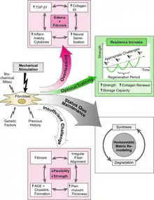 Conversely, tendons that have lost their original strength due to extended periods of inactivity can regain most of their mechanical properties through gradual re-loading of the tendon,[12] due to the tendon's response to mechanical loading. Biological signaling events initiate re-growth at the site, while mechanical stimuli further promote rebuilding. This 6-8 week process results in an increase of the tendon's mechanical properties until it recovers its original strength.[13] However, excessive loading during the recovery process may lead to material failure, i.e. partial tears or complete rupture. Additionally, studies show that tendons have a maximum modulus of approximately 800 MPa; thus, any additional loading will not result in a significant increase in modulus strength.[12] These results may change current physical therapy practices, since aggressive training of the tendon does not strengthen the structure beyond its baseline mechanical properties; therefore, patients are still as susceptible to tendon overuse and injuries.