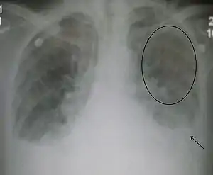 | Acute interstitial pulmonary edema. Note enlarged heart size, apical vascular redistribution ( circle ), and small bilateral pleural effusions ( arrow ). | |