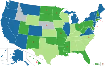 In 2012, success was finally achieved for legalization advocates in the states of Washington and Colorado, when voters approved Initiative 502 and Amendment 64.[62] In subsequent years, cannabis was legalized by ballot measure in Oregon (2014), Alaska (2014), the District of Columbia (2014), California (2016), Nevada (2016), Maine (2016), Massachusetts (2016), Michigan (2018), Arizona (2020), Montana (2020), and New Jersey (2020), and by an act of legislature in Vermont (2018), the Northern Mariana Islands (2018), Guam (2019), Illinois (2019), New York (2021), and Virginia (2021).[1] In all of these jurisdictions, commercial distribution of cannabis has been legalized except for the District of Columbia.[63] Personal cultivation is permitted in all except Washington State and New Jersey.[63][lower-alpha 1] Public consumption and use by individuals under 21 are prohibited in all (though on-premises consumption is allowed in some jurisdictions).