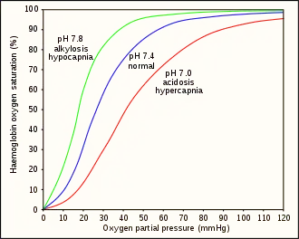 Hyperventilation depletes the blood of carbon dioxide (hypocapnia), which causes respiratory alkylosis (increased pH), and causes a leftward shift in the oxygen–hemoglobin dissociation curve. This results in a lower venous partial pressure of oxygen, which worsens hypoxia.[21] A normally ventilated breath-hold usually breaks (from CO2) with over 90% saturation which is far from hypoxia. Hypoxia produces a respiratory drive but not as strong as the hypercapnic respiratory drive.[12] This has been studied in altitude medicine, where hypoxia occurs without hypercapnia due to the low ambient pressure.[13] The balance between the hypercapnic and hypoxic respiratory drives has genetic variability and can be modified by hypoxic training. These variations imply that predictive risk cannot be reliably estimated, but pre-dive hyperventilation carries definite risks.[6]