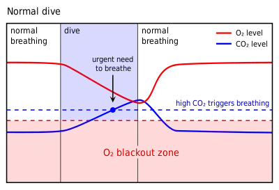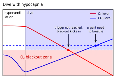 The primary urge to breathe is triggered by rising carbon dioxide (CO2) levels in the bloodstream.[25] Carbon dioxide builds up in the bloodstream when oxygen is metabolized and it needs to be expelled as a waste product. The body detects carbon dioxide levels very accurately and relies on this as the primary trigger to control breathing.[25] Hyperventilation artificially depletes the resting concentration of carbon dioxide causing a low blood carbon dioxide condition called hypocapnia. Hypocapnia reduces the reflexive respiratory drive, allowing the delay of breathing and leaving the diver susceptible to loss of consciousness from hypoxia. For most healthy people, the first sign of low oxygen levels is a greyout or unconsciousness: there is no bodily sensation that warns a diver of an impending blackout.[10]