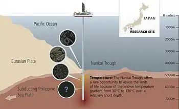 From 1983 to 2003, microbiologists analyzed cell abundances in drill cores from the Ocean Drilling Program.[10] A group led by John Parkes of the University of Bristol reported concentrations of 104 to 108 cells per gram of sediment down to depths of 500 metres (agricultural soils contain about 109 cells per gram).[13] This was initially met with skepticism and it took them four years to publish their results.[9] In 1998, William Whitman and colleagues published a summary of twelve years of data in the Proceedings of the National Academy of Sciences.[13] They estimated that up to 95% of all prokaryotes (archaea and bacteria) live in the deep subsurface, with 55% in the marine subsurface and 39% in the terrestrial subsurface.[10] In 2002, ODP Leg 201 was the first to be motivated by a search for deep life. Most of the previous exploration was on continental margins, so the goal was to drill in the open ocean for comparison.[14][4]