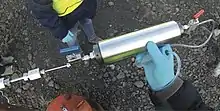 Packers are also used in the continental subsurface,[32] along with devices such as the flow-through in situ reactor (FTISR). Various methods are used to extract fluids from these sites, including passive gas samplers, U-tube systems and osmotic gas samplers.[12] In narrow (less than 50 millimeter) holes, polyamide tubes with a back-pressure valve can be lowered to sample an entire column of fluid.[33][34]