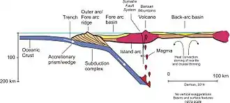 Near subduction zones, volcanoes can form in island arcs and back-arc regions. The subducting plate releases volatiles and solutes to these volcanoes, resulting in acidic fluids with higher concentrations of gases and metals than in the mid-ocean ridge. It also releases water that can mix with mantle material to form serpentinite. When hotspot volcanoes occur in the middle of oceanic plates, they create permeable and porous basalts with higher concentrations of gas than at mid-ocean ridges. Hydrothermal fluids are cooler and have a lower sulfide content. Iron-oxidizing bacteria create extensive deposits of iron oxides.[44]