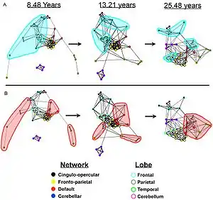 In the infant brain, there is limited evidence of the default network, but default network connectivity is more consistent in children aged 9–12 years, suggesting that the default network undergoes developmental change.[8]