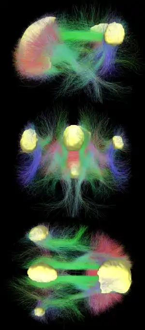 Diffusion MRI imaging shows white matter tracts connecting different areas of the DMN together.[18] The structural connections found from diffusion MRI imaging and the functional correlations from resting state fMRI show the highest level of overlap and agreement within the DMN areas.[1] This provides evidence that neurons in the DMN regions are linked to each other through large tracts of axons and this causes activity in these areas to be correlated with one another.