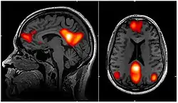![]() fMRI scan showing regions of the default mode network; the medial prefrontal cortex, the posterior cingulate cortex/precuneus and the angular gyrus | |