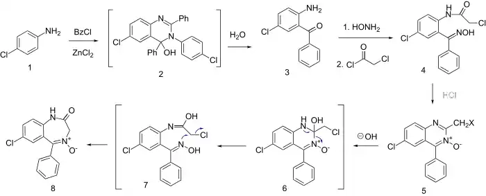 Demoxepam is also an intermediate in the synthesis of oxazepam; it is also used in one of the syntheses of medazepam. It can be considered directly analogous/synonoymous with the synthesis of chlordiazepoxide, with the exception that instead of methylamine, hydroxide ion is the choice of base; here acid is not used for the cyclodehydration step though.