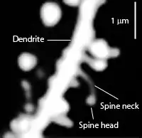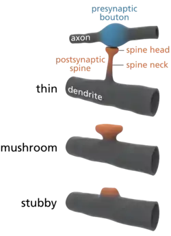 A dendritic spine (or spine) is a small membranous protrusion from a neuron's dendrite that typically receives input from a single axon at the synapse. Dendritic spines serve as a storage site for synaptic strength and help transmit electrical signals to the neuron's cell body. Most spines have a bulbous head (the spine head), and a thin neck that connects the head of the spine to the shaft of the dendrite. The dendrites of a single neuron can contain hundreds to thousands of spines. In addition to spines providing an anatomical substrate for memory storage and synaptic transmission, they may also serve to increase the number of possible contacts between neurons.[1] It has also been suggested that changes in the activity of neurons have a positive effect on spine morphology.[2]