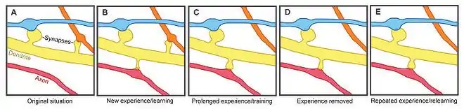 Experience-induced changes in dendritic spine stability also point to spine turnover as a mechanism involved in the maintenance of long-term memories, though it is unclear how sensory experience affects neural circuitry. Two general models might describe the impact of experience on structural plasticity. On the one hand, experience and activity may drive the discrete formation of relevant synaptic connections that store meaningful information in order to allow for learning. On the other hand, synaptic connections may be formed in excess, and experience and activity may lead to the pruning of extraneous synaptic connections.[1]