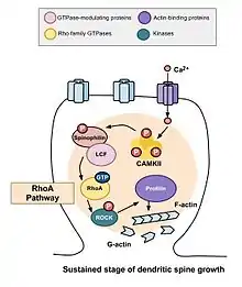 One of the major Rho GTPases involved in spine morphogenesis is RhoA, a protein that also modulates the regulation and timing of cell division. In the context of activity in neurons, RhoA is activated in the following manner: once calcium has entered a cell through NMDA receptors, it binds to calmodulin and activates CaMKII, which leads to the activation of RhoA.[8] The activation of the RhoA protein will activate ROCK, a RhoA kinase, which leads to the stimulation of LIM kinase, which in turn inhibits the protein cofilin. Cofilin's function is to reorganize the actin cytoskeleton of a cell; namely, it depolymerizes actin segments and thus inhibits the growth of growth cones and the repair of axons.[11]