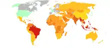 In many undeveloped regions, "authorities do not have adequate facilities to detect dengue cases."[29] Notably, in the Philippines where patients seek herbal medication in lieu of hospitals for treating dengue, death rates as evidenced below are statistically far greater than other affected areas. As many cases go unreported, higher statistics here do not necessarily indicate a larger outbreak. In 2010, Latin America alone reported a sum of 1.5 million cases.[30]