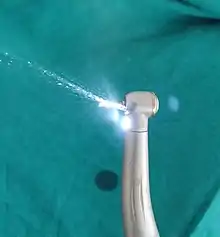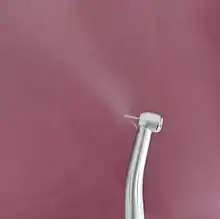 A dental aerosol is an aerosol that is produced from dental instrument, dental handpieces, three-way syringes and other high-speed instruments. These aerosols are air suspended in the clinical environment.[1] These aerosols can pose risks to the clinician, staff and other patients as well. The heavier particles (>50 µm ) of the aerosols suspend in the air for relatively short period and settles down quickly, but the lighter particles tend to remain suspended for longer periods and are capable to enter and get deposited in the lungs when they are inhaled and possess the capacity of transmitting diseases.[2]