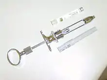 A dental syringe is a syringe for the injection of a local anesthetic.[25] It consists of a breech-loading syringe fitted with a sealed cartridge containing anesthetic solution.