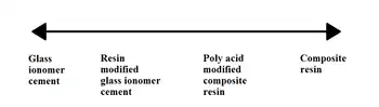Glass ionomer cement - composite resin spectrum of restorative materials used in dentistry. Towards the GIC end of the spectrum, there is increasing fluoride release and increasing acid-base content; towards the composite resin end of the spectrum, there is increasing light cure percentage and increased flexural strength.