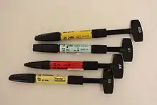 Hybrid composites were introduced in the 1980s and are more commonly known as resin-modified glass ionomer cements (RMGICs).[2] The material consists of a powder containing a radio-opaque fluoroaluminosilicate glass and a photoactive liquid contained in a dark bottle or capsule.[2] The material was introduced, as resin composites on their own were not suitable for Class II cavities.[4] RMGICs can be used instead. This mixture or resin and glass ionomer allows the material to be set by light activation (resin), allowing a longer working time.[2] It also has the benefit of the glass ionomer component releasing fluoride and has superior adhesive properties.[2] RMGICs are now recommended over traditional GICs for basing cavities.[5] There is a great difference between the early and new hybrid composites.[4]