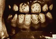 In 1901 Eager published the first description of the "mottled enamel" of immigrants from a small village near Naples, Italy.[32] He writes that the condition is called "Denti di Chiaie" (Chiaie teeth), named after Stefano Chiaie, an Italian professor.[32] In the United States of America, a dentist, Frederick McKay, set up practice in Colorado Springs in 1901 and discovered a high proportion of the residents had stained teeth, locally termed the "Colorado brown stain".[12] He took this information to Greene Vardiman Black, a prominent American dentist of the time. After examining specimens of affected enamel, in 1916 Black described the condition as "[a]n endemic imperfection of the enamel of the teeth, heretofore unknown in the literature of dentistry."[12] They made the interesting observation that although the mottled enamel was hypomineralized, and therefore should be more susceptible to decay, this was not the case.[12] Gradually, they became aware of existing and further reports of a similar condition worldwide.[12]