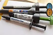 Root canal sealer used in endodontic therapy - Radiopacity in dental materials is an important property that allows for distinguishing restorations from teeth and surrounding structures, assessing the absorption of materials into bone structure, and detecting cement dissolution or other failures that could cause harm to the patient.[11] Cements, composites, endodontic sealers, bone grafts, and acrylic resins all benefit from the addition of radiopaque materials.[11][12] Examples of these materials include zinc oxide, zirconium dioxide, titanium dioxide, barium sulfate, and ytterbium(III) fluoride.[13][14]