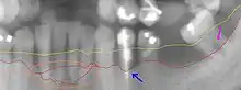 Dental plaque is a biofilm of microorganisms (mostly bacteria, but also fungi) that grows on surfaces within the mouth. It is a sticky colorless deposit at first, but when it forms tartar, it is often brown or pale yellow. It is commonly found between the teeth, on the front of teeth, behind teeth, on chewing surfaces, along the gumline, (supragingival) or below the gumline cervical margins (subgingival).[1] Dental plaque is also known as microbial plaque, oral biofilm, dental biofilm, dental plaque biofilm or bacterial plaque biofilm. Bacterial plaque is one of the major causes for dental decay and gum disease.[1]