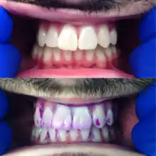There are two main methods of detecting dental plaque in the oral cavity: through the application of a disclosing gel or tablet, and/or visually through observation. Plaque detection is usually detected clinically by plaque disclosing agents. Disclosing agents contain dye which turns bright red to indicate plaque build-up.[1]