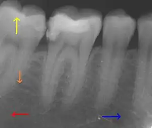The direction toward the root tip(s) or apex(es) of a tooth (the apices), as opposed to coronal, which refers to the direction toward the crown. It may also refer to something relating to the roots, such as apical support. When referring to direction in relation to entities on or of the crown, this term can be synonymous with both cervical and gingival.[1]