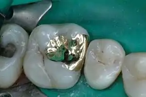 This photo shows teeth #2-5 (Universal numbering system). Tooth #3, the upper right first molar, has an MO (mesial-occlusal) gold inlay. This molar is both posterior, as well as distal, to the premolars in front of it.