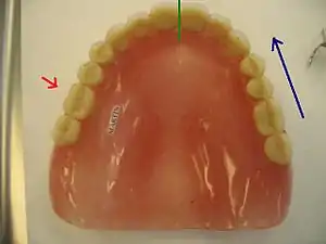 An occlusal view of a complete maxillary denture. The green line, indicating the dental midline, is the defining line when it comes to mesial-distal direction. The blue arrow, which indicates a mesial direction, applies to the opposite side as well up until the green line. The red arrow is directly buccal to the right first maxillary molar, and the name label for the patient (Martin) is embedded in the resin directly palatal to the same tooth.
