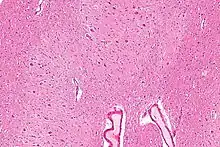 Micrograph of the dentate nucleus (pale pink). H&E stain.