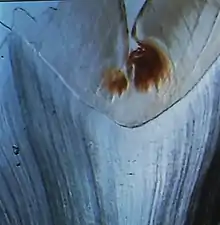 Dentin (/ˈdɛntɪn/) (American English) or dentine (/ˈdɛnˌtiːn/ or /ˌdɛnˈtiːn/) (British English) (Latin: substantia eburnea) is a calcified tissue of the body and, along with enamel, cementum, and pulp, is one of the four major components of teeth. It is usually covered by enamel on the crown and cementum on the root and surrounds the entire pulp. By volume, 45% of dentin consists of the mineral hydroxyapatite, 33% is organic material, and 22% is water.[1] Yellow in appearance, it greatly affects the color of a tooth due to the translucency of enamel. Dentin, which is less mineralized and less brittle than enamel, is necessary for the support of enamel.[2] Dentin rates approximately 3 on the Mohs scale of mineral hardness.[3] There are two main characteristics which distinguish dentin from enamel: firstly, dentin forms throughout life; secondly, dentin is sensitive [4] and can become hypersensitive to changes in temperatur due to the sensory function of odontoblasts[5], especially when enamel recedes and dentin channels become exposed.