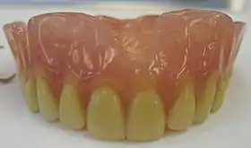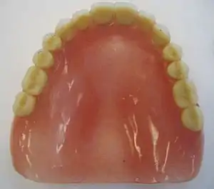 Daily cleaning of dentures is recommended. Plaque and tartar can build up on false teeth, just as they do on natural teeth.[28] Cleaning can be done using chemical or mechanical denture cleaners. Dentures should not be worn continuously, but rather left out of the mouth during sleep.[29] This is to give the tissues a chance to recover, and wearing dentures at night is likened to sleeping in shoes. The main risk is development of fungal infection, especially denture-related stomatitis. Dentures should also be removed while smoking, as the heat can damage the denture acrylic and overheated acrylic can burn the soft tissues.