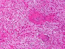 Histologically they resemble very low-grade fibrosarcomas,[2] but they are very locally aggressive and tend to recur even after complete resection. There is a tendency for recurrence in the setting of prior surgery; in one study, two-thirds of patients with desmoid tumors had a history of prior abdominal surgery.[3]