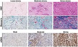 The stroma of the prostate is characteristically muscular.[2] Due to this muscularity, detecting the myofibroblastic phenotypic change indicative of reactive stroma is difficult in an examination of patient pathologic slides.[2] A diagnosis of reactive stroma associated with prostate cancer is one of poor prognosis.[2]